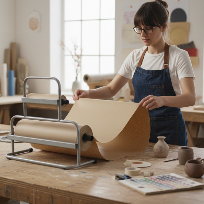 Facilita a organização e o corte do papel em ambientes de loja ou atelier criativo.