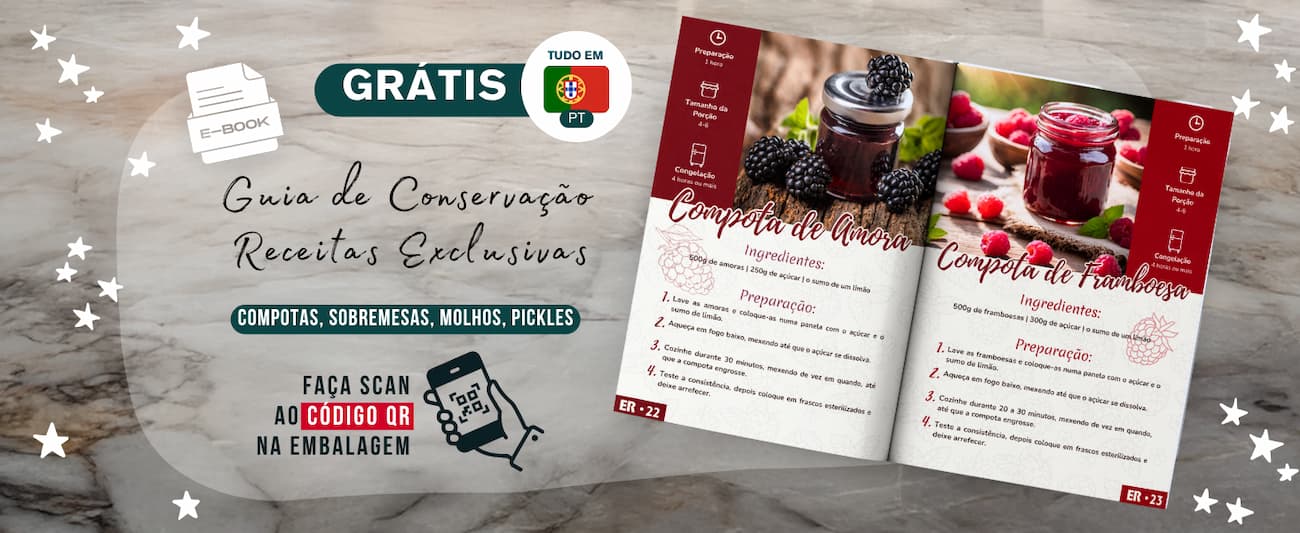 Pack de 10 frascos de vidro de 240 ml com tampas douradas, caixas kraft e etiquetas personalizáveis. Inclui E-BOOK GRÁTIS com +50 receitas de compotas, sobremesas, molhos e conservas, além de um guia completo de conservação em frascos. Ideais para presentes, eventos ou uma cozinha sustentável. Acede ao e-book através do QR incluído.