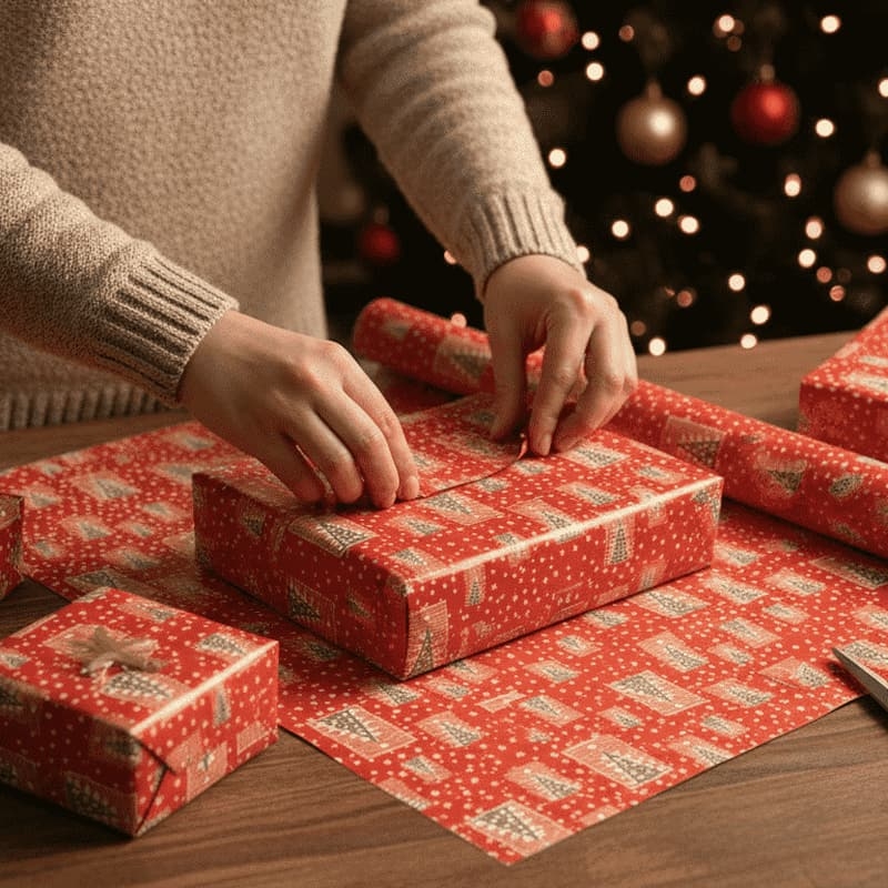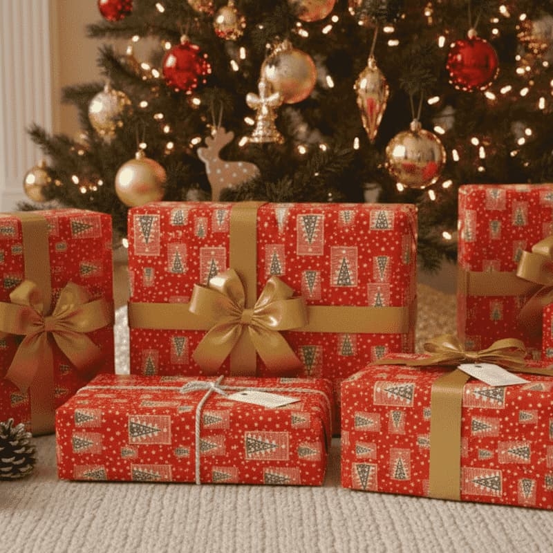 Papel de embrulho natalício com design Shiny Tree – ideal para presentes festivos e encantadores.