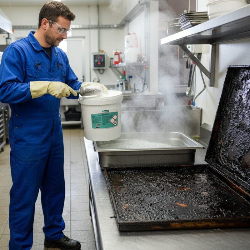 Detergente em pó concentrado para limpeza profunda de gorduras em fogões e equipamentos industriais.